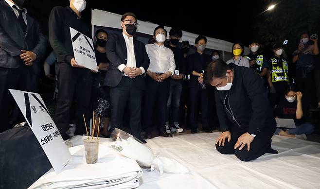 [서울=뉴시스] 홍효식 기자 = 코로나19 경영난으로 극단적인 선택을 한 자영업자들을 기리기 위한 합동분향소 설치가 경찰 제지로 무산돼 임시 분향소 자리가 마련된 16일 오후 서울 영등포구 여의도 국회 앞에서 국민의힘 최승재 의원이 추모하고 있다. 2021.09.16. yesphoto@newsis.com