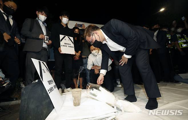 [서울=뉴시스] 홍효식 기자 = 코로나19 경영난으로 극단적인 선택을 한 자영업자들을 기리기 위한 합동분향소 설치가 경찰 제지로 무산돼 임시 분향소 자리가 마련된 16일 오후 서울 영등포구 여의도 국회 앞에서 김기홍 자영업자비대위 공동대표가 분향하고 있다. 2021.09.16. yesphoto@newsis.com