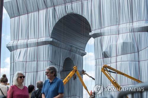 epa09471465 People look at the last preparations on the assembly of the 'Arc de Triomphe' wrapping as part of an art installation by late Bulgarian-born US artist Christo, in Paris, France, 16 September 2021. The monumental installation wraps the landmark Parisian monument under 25,000 square meters of silver and blue fabric. It will be officially inaugurated 18 September and runs until 03 October 2021. EPA/CHRISTOPHE PETIT TESSON