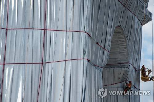 epa09471472 Steeplejacks work on the last preparations on the assembly of the 'Arc de Triomphe' wrapping as part of an art installation by late Bulgarian-born US artist Christo, in Paris, France, 16 September 2021. The monumental installation wraps the landmark Parisian monument under 25,000 square meters of silver and blue fabric. It will be officially inaugurated 18 September and runs until 03 October 2021. EPA/CHRISTOPHE PETIT TESSON