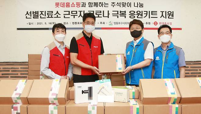 롯데홈쇼핑은 추석을 앞두고 16일 영등포구 선별진료소 의료진 및 방역 관계자 100여 명에게 '응원 키트'를 지원하고, '영등포구사회복지협의회'에 기부금 8천만 원을 전달했다.