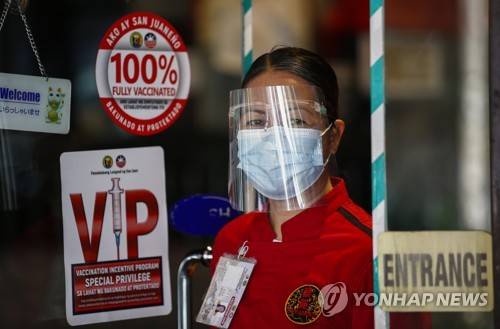 epaselect epa09470888 A restaurant staff, wearing a face mask and face shield, waits for customers at the entrance displaying COVID-19 protocol certifications in San Juan City, Metro Manila, Philippines, 16 September 2021. Food businesses in the Philippine capital region of Metro Manila resumed indoor and outdoor dining services with guidelines under new COVID-19 protocols implemented on 16 September, with certification given to establishments with fully vaccinated staff serving limited indoor and outdoor dining to vaccinated and unvaccinated customers. EPA/ROLEX DELA PENA
