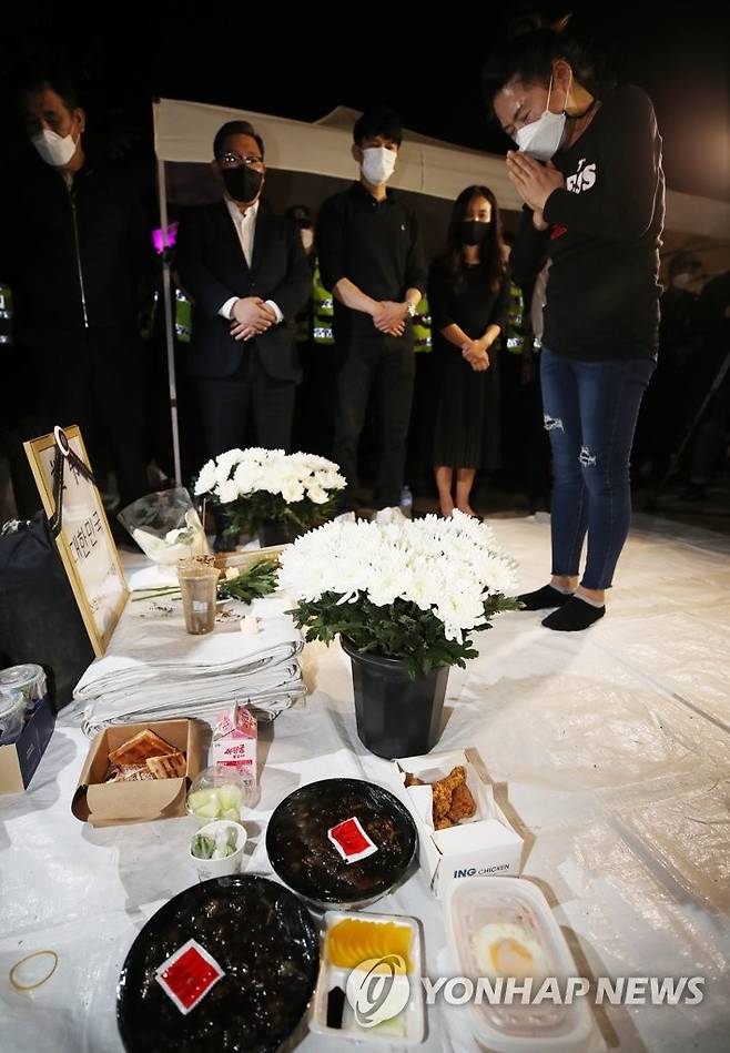 (서울=연합뉴스) 박동주 기자 = 전국자영업비상대책위원회 소속회원들이 16일 오후 여의도 국회의사당역 3번 출구 앞에 최근 생활고에 시달리다 세상을 떠난 자영업자들을 추모하고 정부에 영업제한조치 철폐를 촉구하는 분향소를 설치한 뒤 예를 갖추고 있다. 분향소에는 국화와 음식 등이 놓여 있다. 2021.9.16
