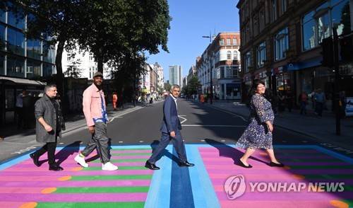 epaselect epa09471224 Mayor of London, Sadiq Khan (C-R) and British artist Yinka Ilori (C-L) pose for photographers during a photocall in London, Britain 16 September 2021. The Mayor of London, Sadiq Khan unveiled 'Bring London Together' a new public art commission transforming 18 pedestrian crossings with distinctive designs. The project is designed to draw Londoners and visitors to central London in order to support the capital?s creative, retail and hospitality sectors which have been disproportionately affected by the pandemic. EPA/FACUNDO ARRIZABALAGA
