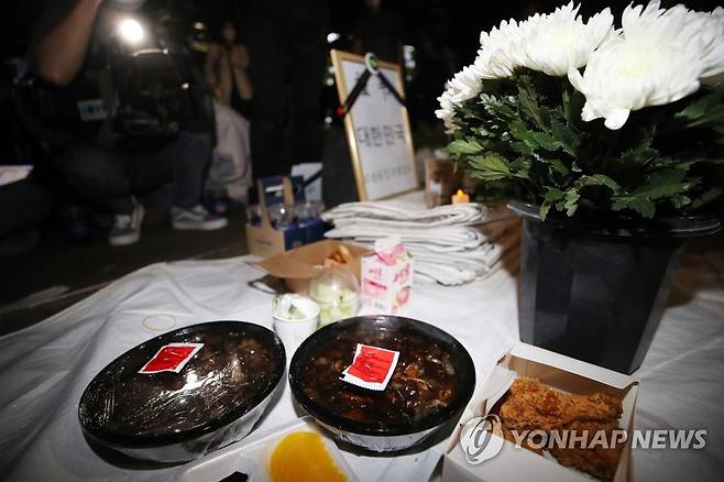 (서울=연합뉴스) 박동주 기자 = 생활고에 시달리던 자영업자들의 사망 소식이 잇따르는 가운데 자영업자 단체가 16일 서울 국회의사당역 앞에 설치한 분향소에 국화와 음식 등이 놓여 있다. 이날 낮 코로나19 대응 전국자영업자비상대책위원회(자대위)는 여의도 국회 앞에 합동 분향소를 설치하려다 경찰이 방역법 위반 등을 이유로 막자 1인 분향을 제안했었다. 2021.9.16