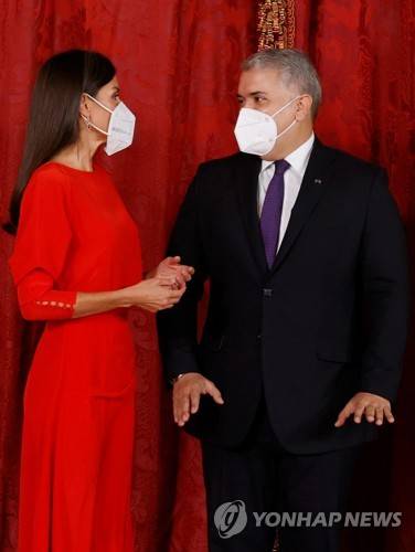 epa09471479 Spanish Queen Letizia (L) speaks with Colombian President Ivan Duque prior to an official luncheon held at the Royal Palace in Madrid, Spain, 16 September 2021. EPA/Ballesteros