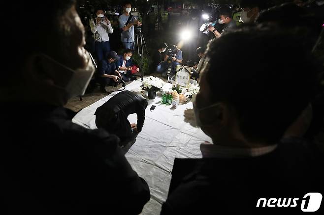 (서울=뉴스1) 조태형 기자 = 16일 오후 서울 영등포구 국회의사당역 3번출구 앞에 코로나19 장기화에 따른 정부의 영업제한으로 생활고에 시달려 극단선택을 한 자영업자를 추모하기 위한 임시분향소가 마련돼 자영업자들의 추모행렬이 이어지고 있다. 2021.9.16/뉴스1