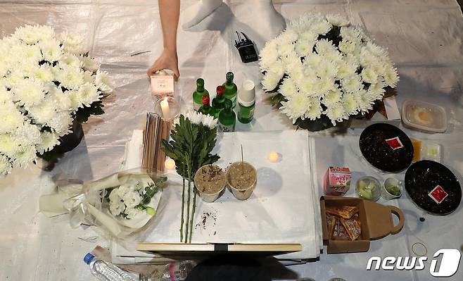 (서울=뉴스1) 조태형 기자 = 16일 오후 서울 영등포구 국회의사당역 3번출구 앞에 코로나19 장기화에 따른 정부의 영업제한으로 생활고에 시달려 극단선택을 한 자영업자를 추모하기 위한 임시분향소가 마련돼 자영업자들의 추모행렬이 이어지고 있다. 2021.9.16/뉴스1