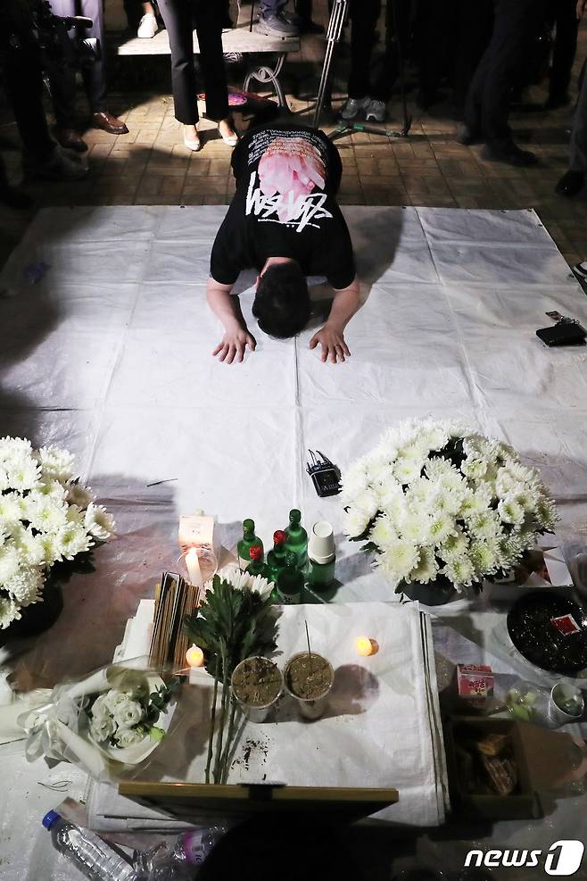 (서울=뉴스1) 조태형 기자 = 16일 오후 서울 영등포구 국회의사당역 3번출구 앞에 코로나19 장기화에 따른 정부의 영업제한으로 생활고에 시달려 극단선택을 한 자영업자를 추모하기 위한 임시분향소가 마련돼 자영업자들의 추모행렬이 이어지고 있다. 2021.9.16/뉴스1