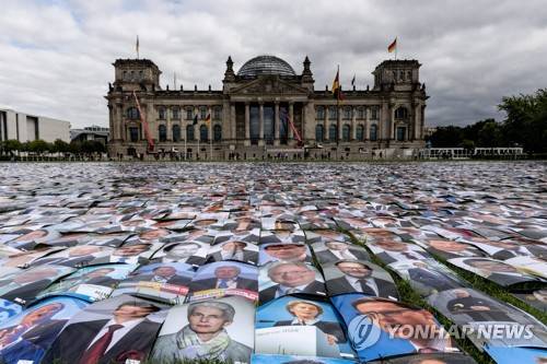 epa09471506 Photos of German politicians are placed by activists from Human rights group Unverhandelbar (non-negotiable) in front of the Reichstag building, seat of the German parliament, during protest against human rights violations at Europe's external borders in Berlin, Germany, 16 September 2021. EPA/FILIP SINGER