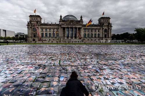 epa09471507 Photos of German politicians are placed by activists from Human rights group Unverhandelbar (non-negotiable) in front of the Reichstag building, seat of the German parliament, during protest against human rights violations at Europe's external borders in Berlin, Germany, 16 September 2021. EPA/FILIP SINGER