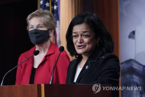 FILE - In this March 1, 2021, file photo Rep. Pramila Jayapal, D-Wash., right, with Sen. Elizabeth Warren, D-Mass., at left, speaks during a news conference on Capitol Hill in Washington. One side is energized by the prospect of the greatest expansion of government support since the New Deal nearly a century ago. The other is fearful about dramatically expanding Washington's reach at an enormous cost. They are all Democrats, yet are taking vastly different approaches to the the massive $3.5 trillion spending bill moving through Congress. (AP Photo/Susan Walsh, File) March 1, 2021, file photo