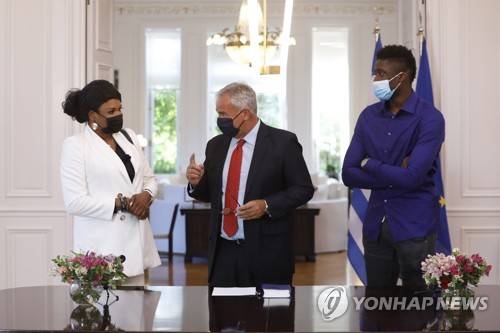 epa09471633 Greek Interior Minister Makis Voridis (C) grands Greek citizenship to Veronica (L) and Alex Antetokounmpo (R), mother and brother of Milwaukee Bucks forward Giannis Antetokounmpo, during a ceremony at the Maximos Mansion in Athens, Greece, 16 September 2021. EPA/COSTAS BALTAS/POOL