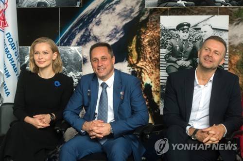 epa09471659 A handout photo made available on the official website of the Russian State Space Corporation ROSCOSMOS shows the International Space Station (ISS) expedition 66 members, Russian cosmonaut Anton Shkaplerov (C), film director Klim Shipenko (R) and actress Yulia Peresild (L), attending a press conference at the Star city outside Moscow, Russia, 16 September 2021. The Russian film crew plans to make a movie onboard the International Space Station. EPA/ROSCOSMOS HANDOUT MANDATORY CREDIT HANDOUT EDITORIAL USE ONLY/NO SALES
