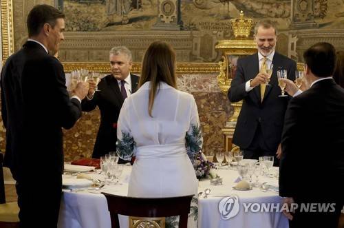 epa09471712 Spain's King Felipe VI (2-R) and Queen Letizia (unseen) chair a luncheon in honor of Colombian President, Ivan Duque (2-L), and his wife Maria Juliana Ruiz (front, C), in presence of Spanish Prime Minister Pedro Sanchez (L) and Spanish Foreign Minister Jose Manuel Albares (R) held at the Royal Palace in Madrid, Spain, 16 September 2021. EPA/Ballesteros / POOL