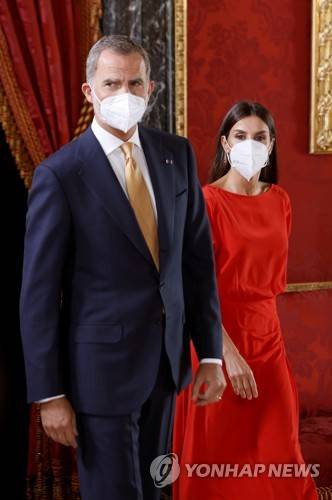 epa09471716 Spain's King Felipe VI (L) and Queen Letizia (R) arrive to welcome Colombian President Duque and his wife (both not pictured) prior to an official luncheon held at the Royal Palace in Madrid, Spain, 16 September 2021. EPA/EMILIO NARANJO / POOL