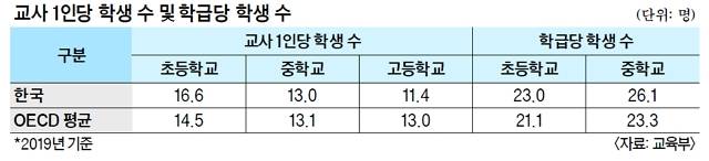 교사 1인당 학생 수가 많이 개선됐음에도 학급당 학생 수가 OECD 평균보다 높다는 것은 교원 자원의 배분, 시설(학급) 확충 등 정책 판단이 효율적이지 못했음을 보여준다는 분석이 나온다.
