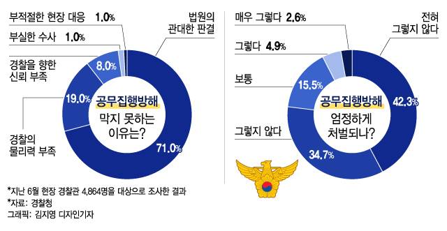 이 때문에 일선 경찰들은 경찰폭행이 끊이지 않은 가장 큰 이유로 '법원 판결'을 꼽았다. 지난 6월 자체 설문조사에서 경찰 폭행이 왜 계속 벌어지는지 묻는 질문에는 응답자의 71%가 "법원의 관대한 판결 때문"이라고 답했다. 공무집행방해죄가 엄정하게 처벌되는지에 대한 답변으로는 77%가 "적절하지 않다"라고 했다.