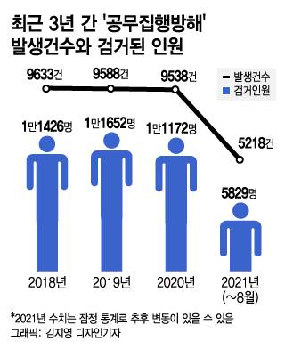 16일 경찰청에 따르면 올해 1~8월까지 공무집행방해 사건은 총 5218건 발생한 것으로 잠정 집계됐다. 연도별로는 △2018년 9633건 △2019년 9588건 △2020년 9538건 등으로 한 해동안 1만건에 가까운 공무집행방해 사건이 발생했다.