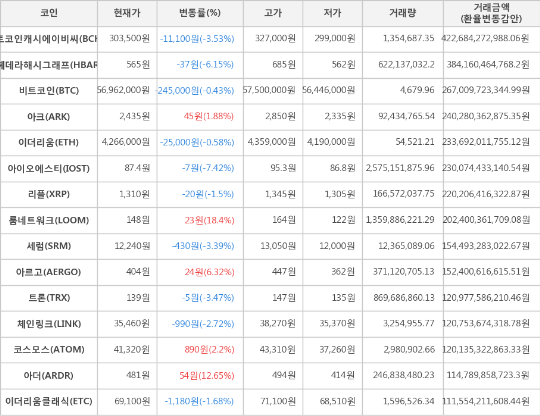 [표]가상화폐 시세 (제공: 암호화폐 거래소 업비트)