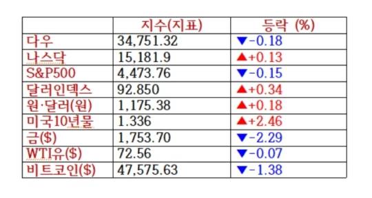 16일(현지시간) 뉴욕증권거래소에서 다우존스30 산업평균지수는 전일보다 63.07포인트(0.18%) 내린 3만4751.32에, 스탠더드앤드푸어스(S&P)500 지수는 전장보다 6.95포인트(0.16%) 떨어진 4473.75로 마감했다. 기술주 중심의 나스닥지수는 전장보다 20.39포인트(0.13%) 오른 1만5181.92에 거래를 마쳤다.