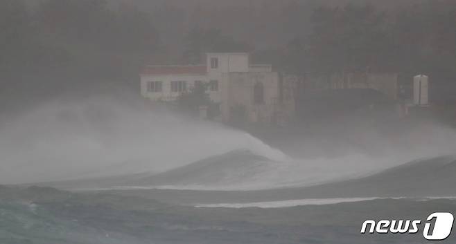 (서귀포=뉴스1) 오현지 기자 = 제4호 태풍 찬투가 제주에 최근접한 17일 오전 서귀포시 성산읍 섭지코지 인근 해변에 거친 파도가 일고 있다. 2021.9.17/뉴스1