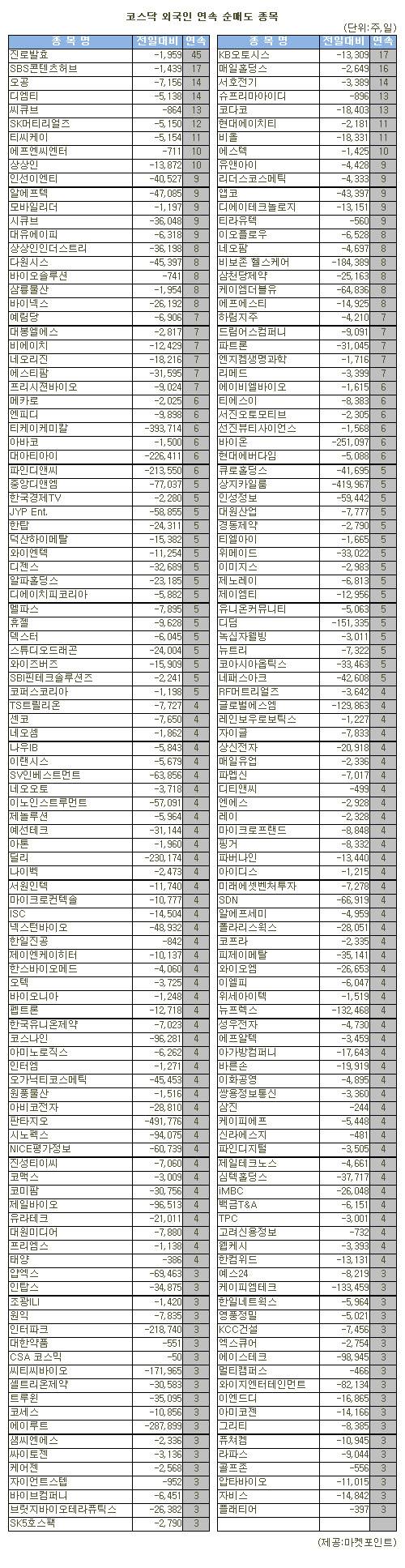 [표]코스닥 외국인 연속 순매도 종목(16일)