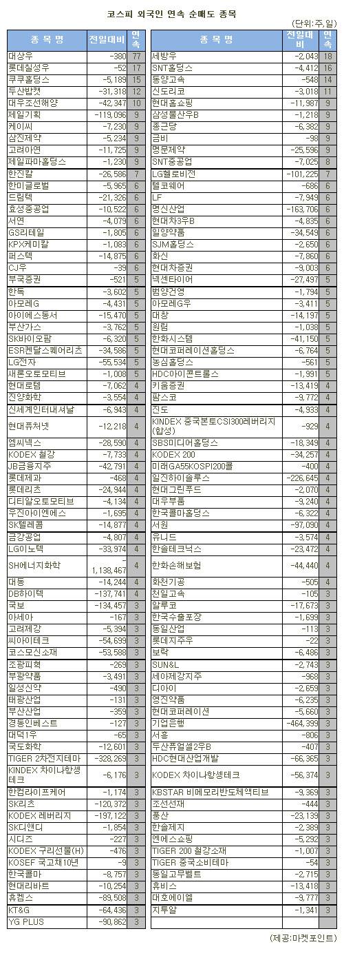 [표]코스피 외국인 연속 순매도 종목(16일)
