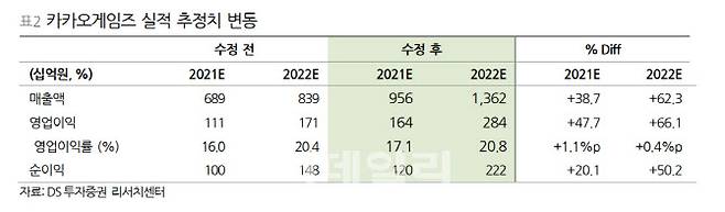강성훈 DS투자증권 연구원은 이날 보고서에서 “3분기 카카오게임즈의 실적은 매출액 3707억원, 영업이익 773억원으로 전망한다”며 “경쟁작 출시 이후에도 꾸준히 매출 순위 1위를 유지하고 있다”고 설명했다.
