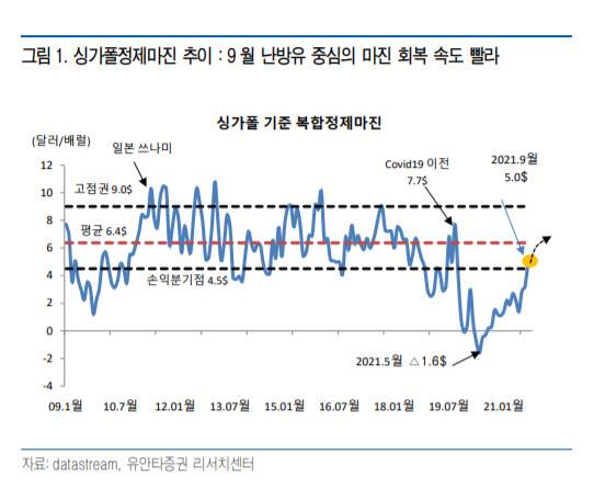 황규원 유안타증권 연구원은 리포트에서 "9월부터 2022년 1분기까지 국제유가 상승, 정제마진 회복, OSP(공식판매가격) 하락으로 본업인 정유부문의 회복 모멘텀이 뚜렷할 전망"이라고 밝혔다.