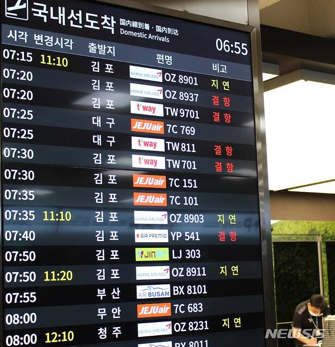 [제주=뉴시스] 양영전 기자 = 제14호 태풍 ‘찬투’가 제주에 근접한 17일 오전 제주국제공항 1층 도착장 항공정보안내판에 제주행 항공기 결항 정보가 표시되고 있다. 2021.09.17. 0jeoni@newsis.com