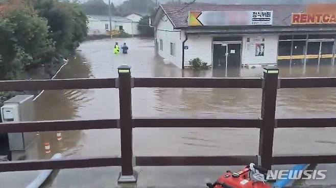 [제주=뉴시스] 양영전 기자 = 제14호 태풍 '찬투'가 제주에 근접한 17일 오전 제주시 용담이동 인근 저지대가 폭우에 침수돼 소방대원들이 배수 지원을 하고 있다. (사진=제주소방서 제공 영상 캡처) 2021.09.17. photo@newsis.com