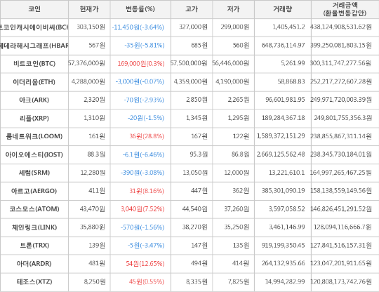 또한, 아더(12.65%, 481원), 아르고(8.16%, 411원), 코스모스(7.52%, 43,470원), 테조스(0.55%, 8,250원)가 상승세를 나타냈다.
