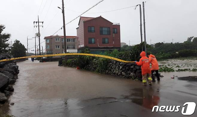 (제주=뉴스1) 오미란 기자 = 제14호 태풍 '찬투(CHANTHU)'가 북상 중인 17일 오전 7시30분쯤 제주시 조천읍의 한 도로가 침수돼 통제되고 있다.(제주도 소방안전본부 제공)2021.9.17/뉴스1