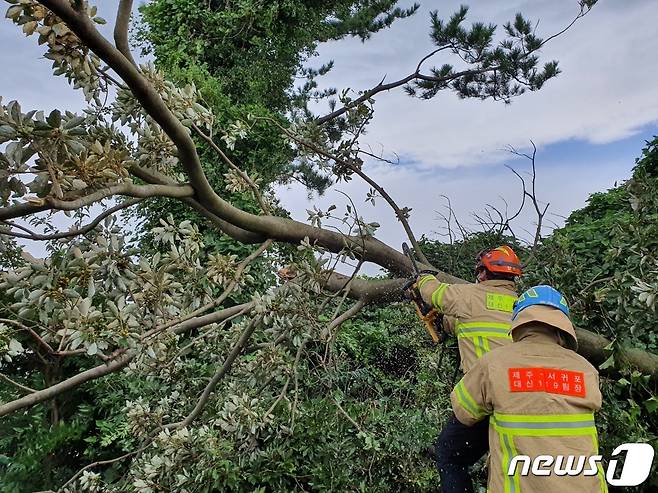(제주=뉴스1) 오미란 기자 = 제14호 태풍 '찬투(CHANTHU)'가 북상 중인 17일 오전 7시54분쯤 제주 서귀포시 강정동에서 강풍에 나무 한 그루가 쓰러져 안전조치가 이뤄지고 있다.(제주도 소방안전본부 제공)2021.9.17/뉴스1