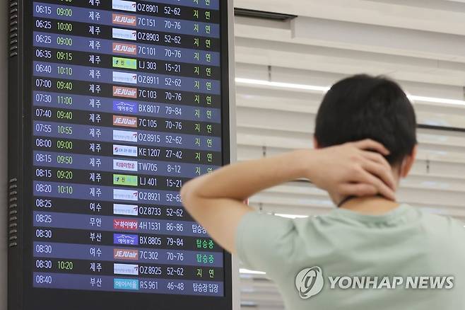(서울=연합뉴스) 임화영 기자 = 17일 오전 제14호 태풍 '찬투'의 영향으로 김포공항 국내선 청사 운항 안내판에 제주행 비행편들의 지연 표시가 돼있다. 2021.9.17