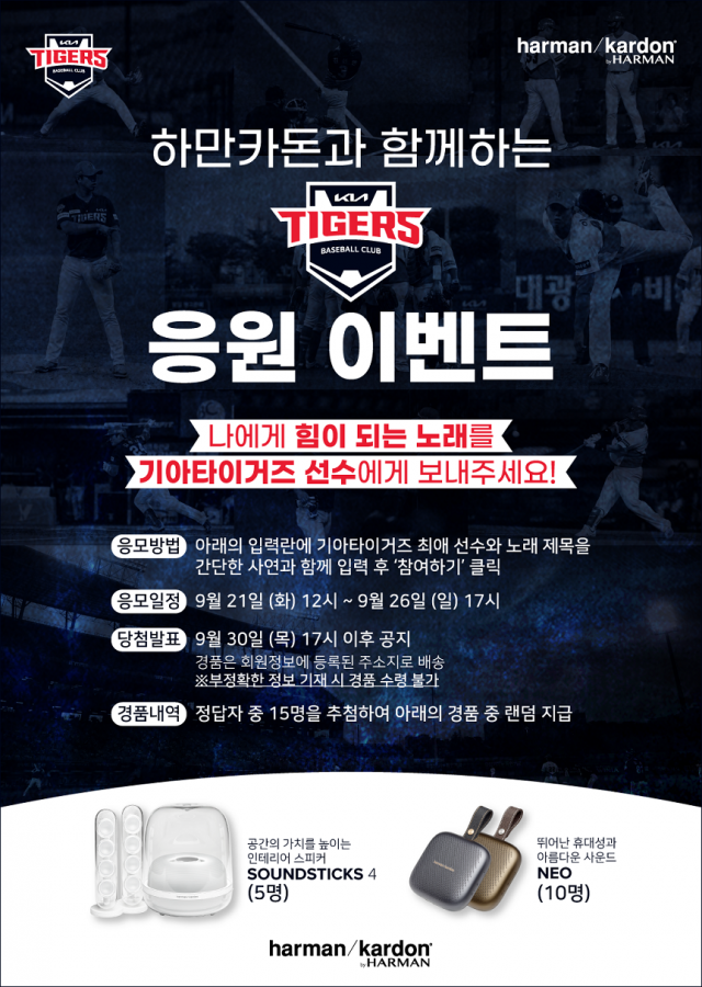 또한 하만인터내셔널코리아는 추석 연휴 포함(9월 21~26일) 기간 동안 하만카돈 브랜드와 함께하는 랜선 응원 '나에게 힘이 되는 노래를 기아 타이거즈 선수들에게 보내주세요'를 진행한다.