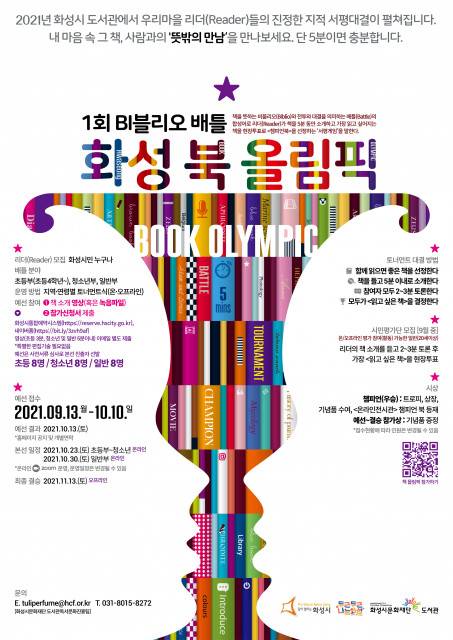 화성시문화재단 도서관(대표이사 이종원)에서 시민 대상 서평 게임 '제1회 비블리오 배틀-화성 북 올림픽'을 개최, 참가자를 9월 13일부터 10월 10일까지 모집한다.