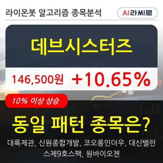 이 시각 거래소에서 데브시스터즈 이외에도 대륙제관(11.26%), 신원종합개발(14.53%), 코오롱인더우(10.22%), 대신밸런스제9호스팩(10.06%), 원바이오젠(16.43%) 등이 상승세를 보이고 있다.