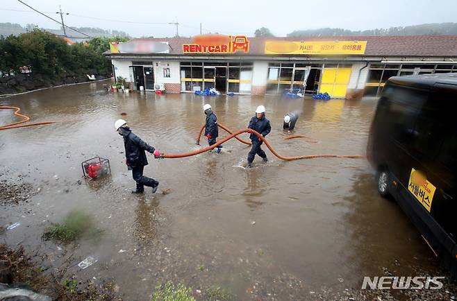[제주=뉴시스] 우장호 기자 = 제14호 태풍 '찬투(CHANTHU)'가 제주를 통과한 17일 오전 제주시 용담2동에 위치한 상가 건물과 부지가 불어난 빗물에 침수돼 배수지원이 이뤄지고 있다. 2021.09.17. woo1223@newsis.com