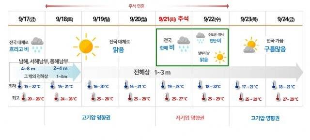 추석 다음날인 22일 오전까지는 수도권과 강원 영서 지방 등 중부 지방에 비가 이어진다. 북쪽에서 한차례 더 비구름이 내려오기 때문이다. 추석 연휴가 끝난 23일부터는 다시 구름이 개고 전국의 날씨가 맑아진다. 북쪽에서 찬 공기가 내려와 아침저녁으로 더 선선해지고 일교차가 벌어질 가능성이 있다.