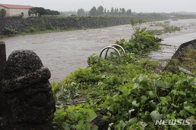 [서귀포=뉴시스] 양영전 기자 = 제14호 태풍 ‘찬투’가 제주에 근접한 17일 오전 서귀포시 표선면 천미천에 급류가 흐르고 있다. 천미천은 총 길이 25㎞로 제주도내 143개 하천 가운데 가장 긴 하천이다. 2021.09.17. 0jeoni@newsis.com
