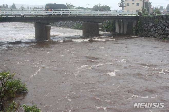 [서귀포=뉴시스] 양영전 기자 = 제14호 태풍 ‘찬투’가 제주에 근접한 17일 오전 서귀포시 표선면 천미천에 급류가 흐르고 있다. 천미천은 총 길이 25㎞로 제주도내 143개 하천 가운데 가장 긴 하천이다. 2021.09.17. 0jeoni@newsis.com