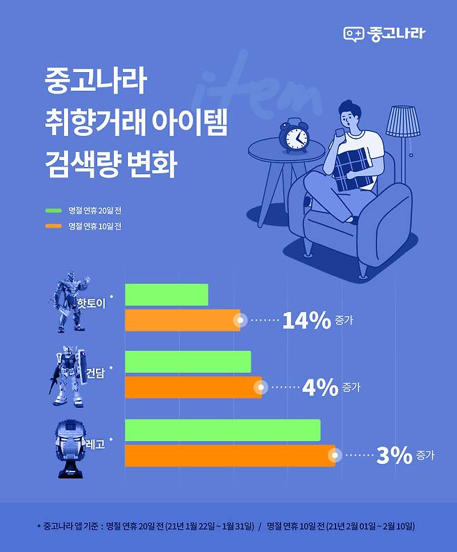 17일 중고나라에 따르면 지난해와 올해 자사 어플리케이션(앱)의 명절 연휴 거래 및 검색 데이터를 토대로 중고거래 트렌드를 분석한 결과, 대표적 취향 아이템인 레고(3%) 건담(4%) 핫토이(14%) 등의 검색량이 증가했다.