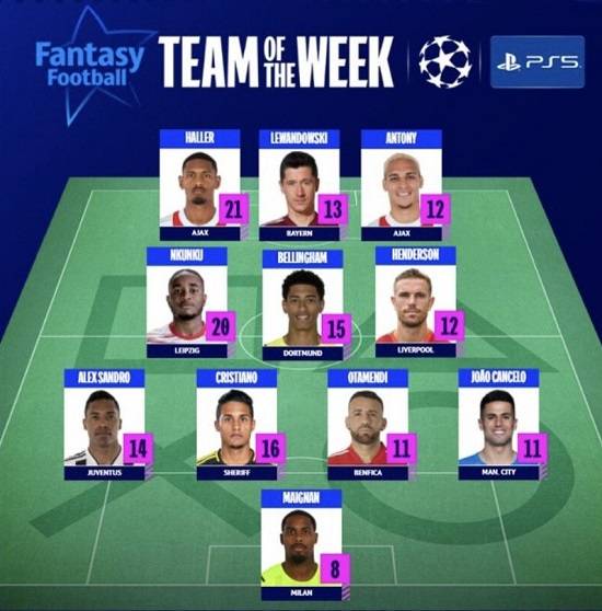 공격수 역시 3명이었다. 스포르팅 CP전 무려 4골을 기록한 세바스티안 할러와 할러의 4골 중 2골을 도운 안토니가 나란히 이름을 올렸다. 바르셀로나를 상대로 2골을 터뜨린 바이에른 뮌헨의 로베르토 레반도프스키가 남은 한 자리를 차지했다.