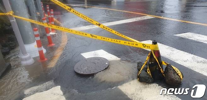 (제주=뉴스1) 오미란 기자 = 제14호 태풍 '찬투(CHANTHU)'가 북상 중인 17일 오전 제주시 오라2동의 한 도로에서 맨홀 뚜껑이 열려 빗물이 역류하고 있다.(제주도 소방안전본부 제공)2021.9.17/뉴스1
