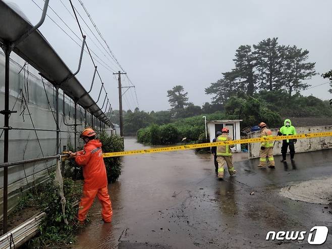 (제주=뉴스1) 오미란 기자 = 제14호 태풍 '찬투(CHANTHU)'가 북상 중인 17일 오전 제주시 이호2동의 한 도로가 침수돼 인근에 통제선이 설치되고 있다.(제주도 소방안전본부 제공)2021.9.17/뉴스1