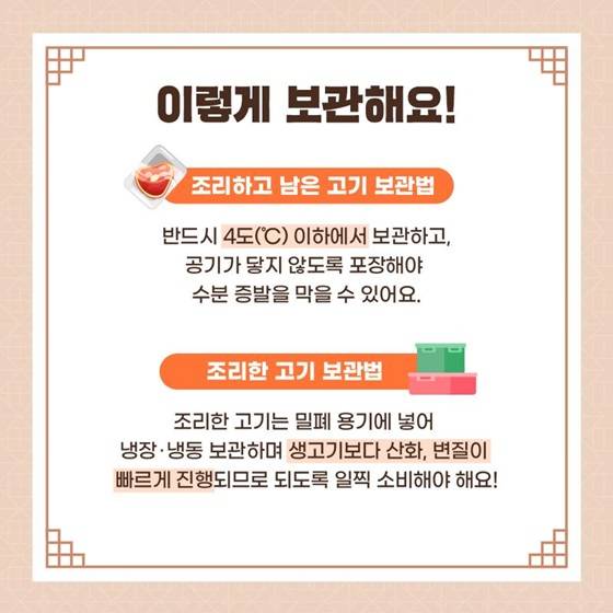 조리한 고기는 밀폐 용기에 넣어 냉장·냉동 보관하며 생고기보다 산화, 변질이 빠르게 진행되므로 되도록 일찍 소비해야 해요!