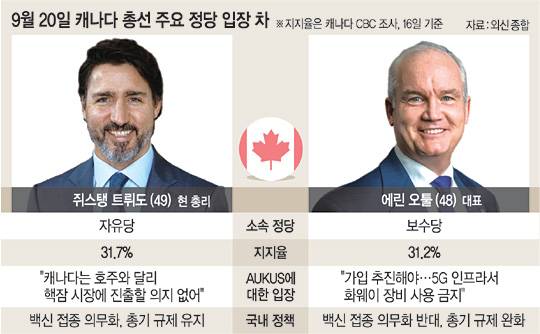 오는 20일 캐나다 총선을 4일 앞두고 미국·영국·호주 간 3자 군사·안보협의체 '오커스(AUKUS)'가 뜨거운 감자로 떠오르고 있다.