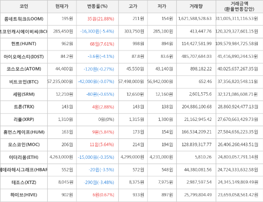 또한, 아이오에스티(-4.1%, 84.2원), 헤데라해시그래프(-3.5%, 552원), 테조스(-3.48%, 8,045원), 세럼(-0.65%, 12,210원), 이더리움(-0.35%, 4,263,000원), 코스모스(-0.27%, 44,400원)가 하락세를 나타냈다.